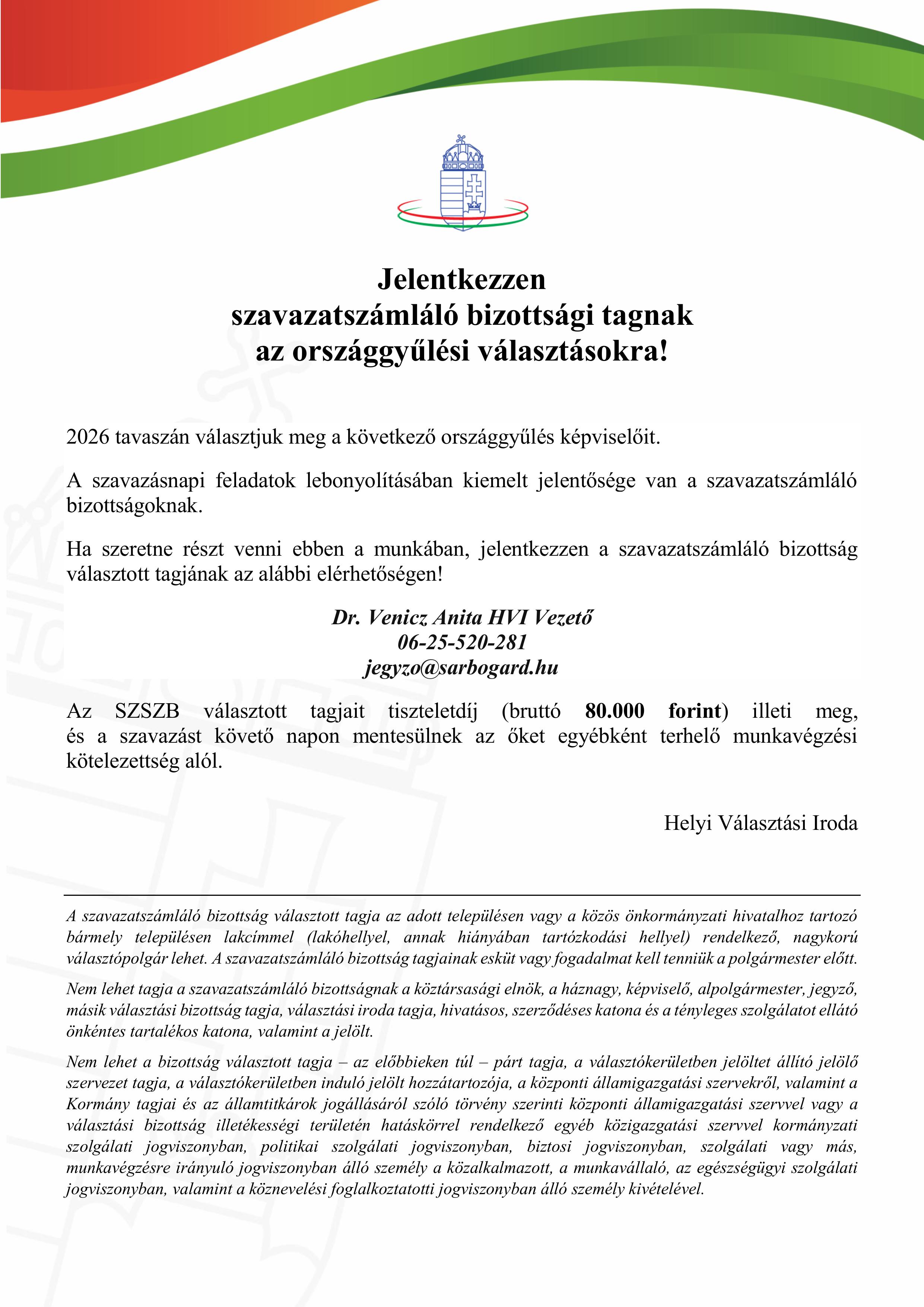 Kérem, tekintsenek úgy erre a megjelenési formára, mint az önkormányzat kinyújtott kezére, amelyet bármikor megfoghatunk. Továbbra is igyekszünk számos közérdekű és közhasznú adatot közölni a honlapon mindenkivel és ezáltal kedvet csinálni Sárbogárdhoz. Természetesen, akinek bármi gondja, problémája van, úgy magam és képviselőtársaim is állunk szíves rendelkezésükre. A választási ered-mény egy jó kezdet, most pedig alakítsuk tovább Sárbogárd történetét együtt legjobb  szándékunk és tehet-ségünk szerint.